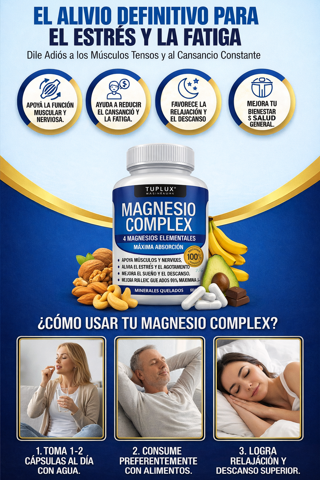 Magnesio Suplemento Completo 8 en 1 Ayuda a Dormir Mejor, Reducir Calambres y Recuperar tu Energía